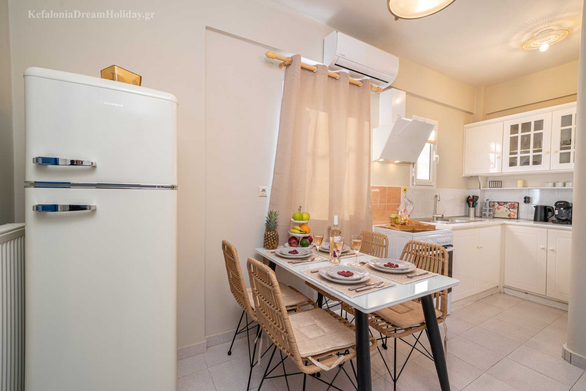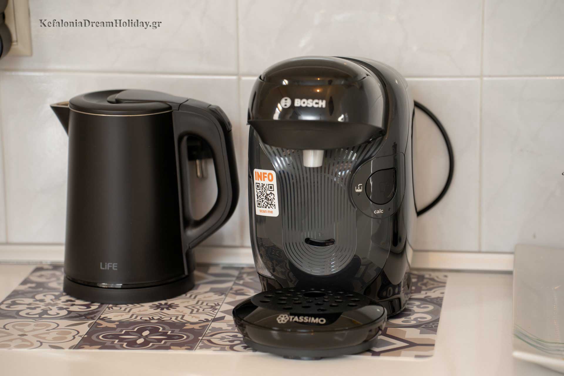 KITCHEN ): Refrigerator, freezer, oven, stovetop, coffee maker, electric kettle, kitchenware, dishes & utensils.