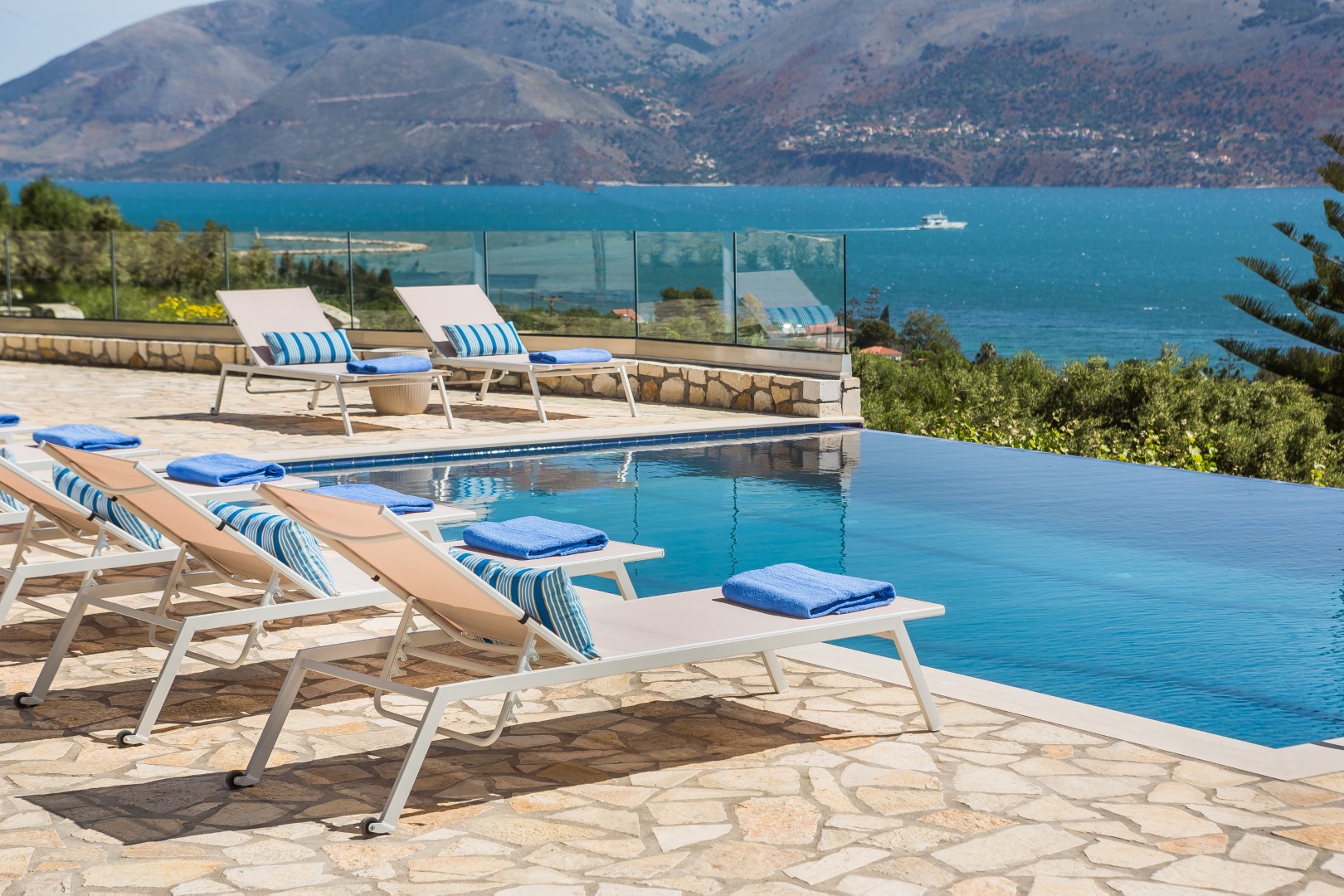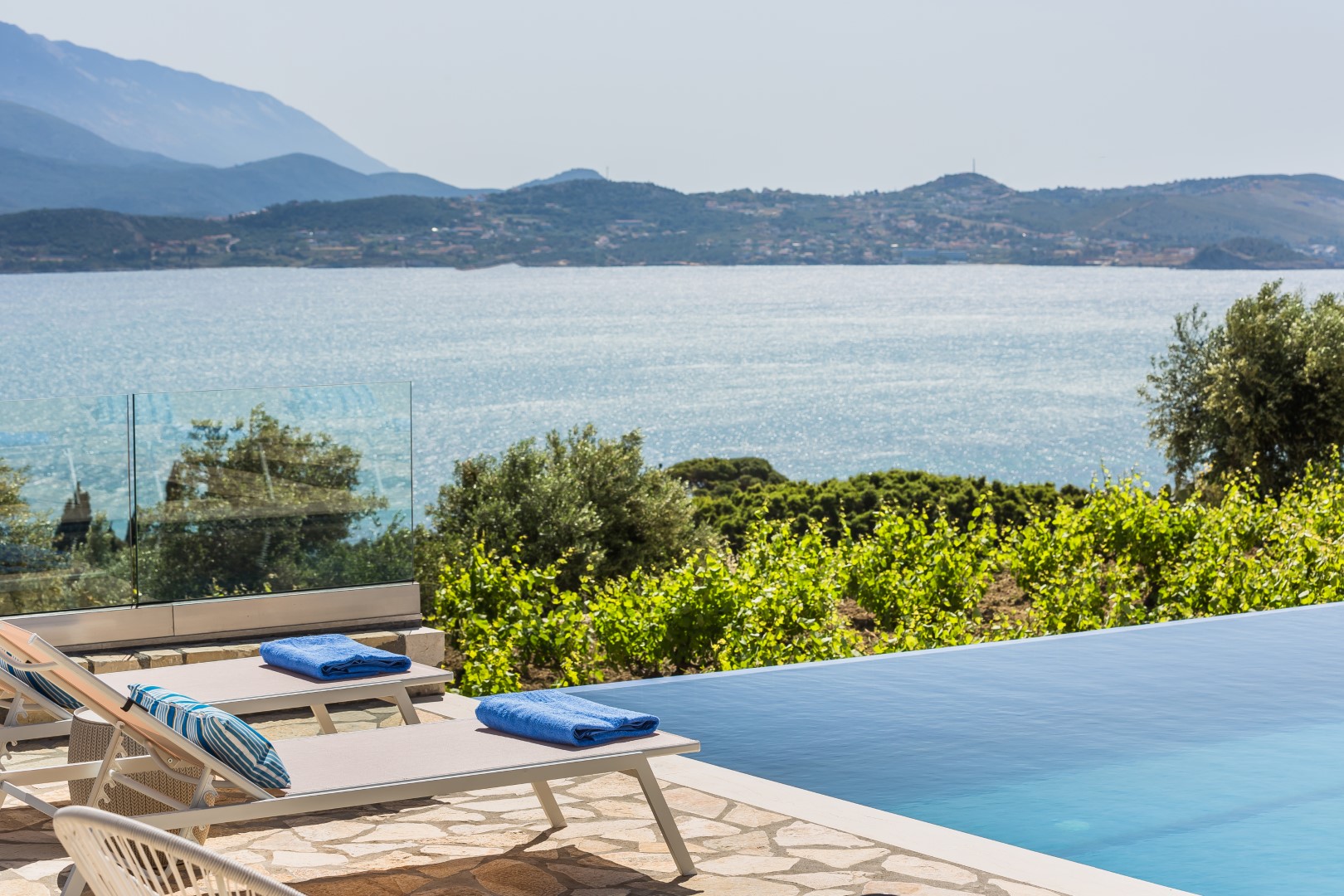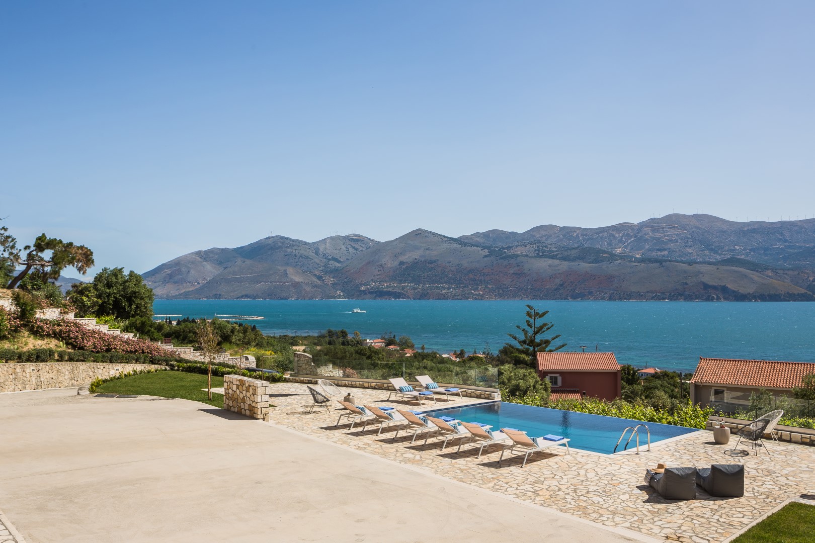 OUTDOORS: Breathtaking sea views, loungers and umbrellas, infinite swimming pool, open poolside shower, BBQ, well cared garden, shared washing machine,.