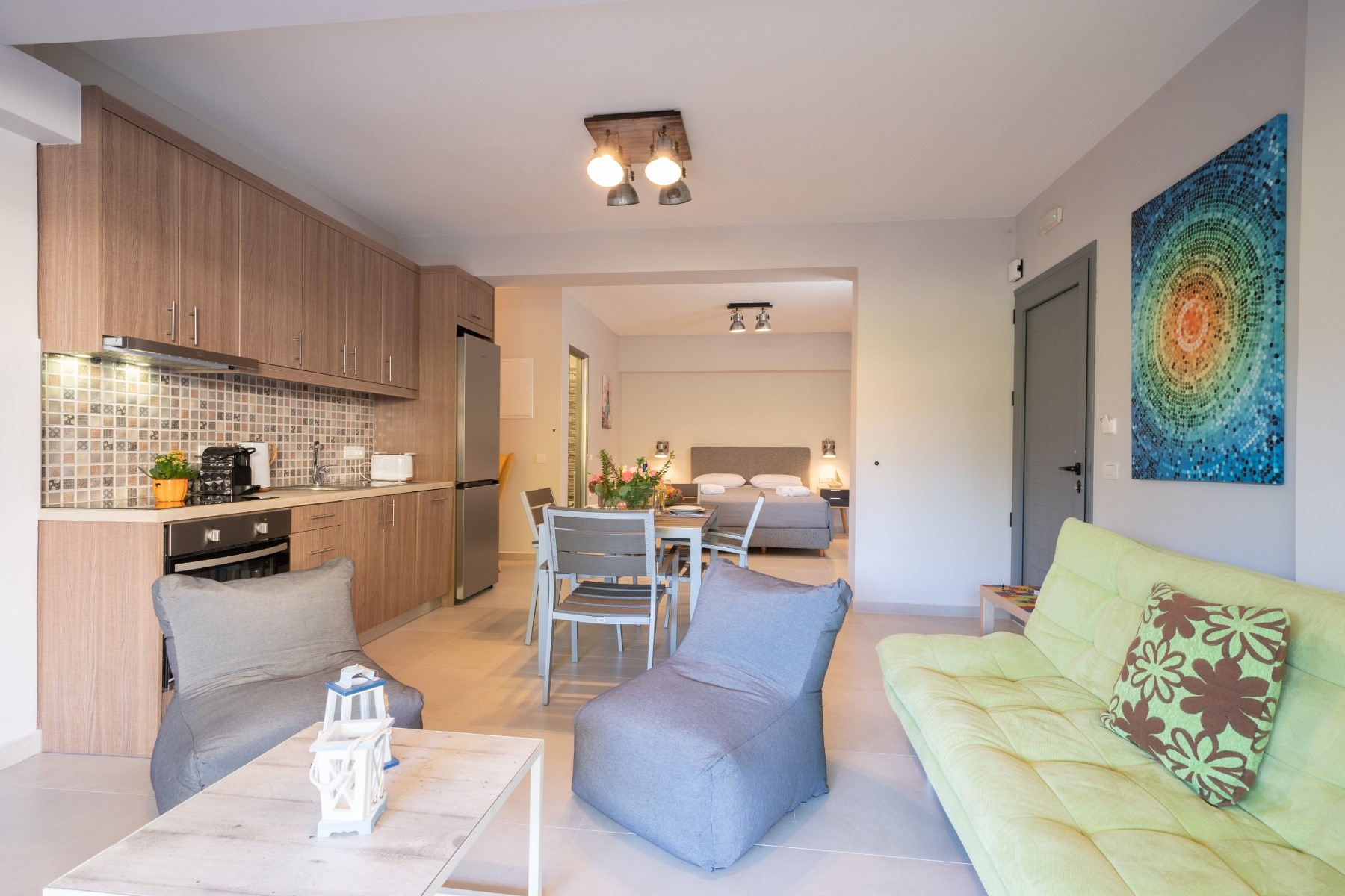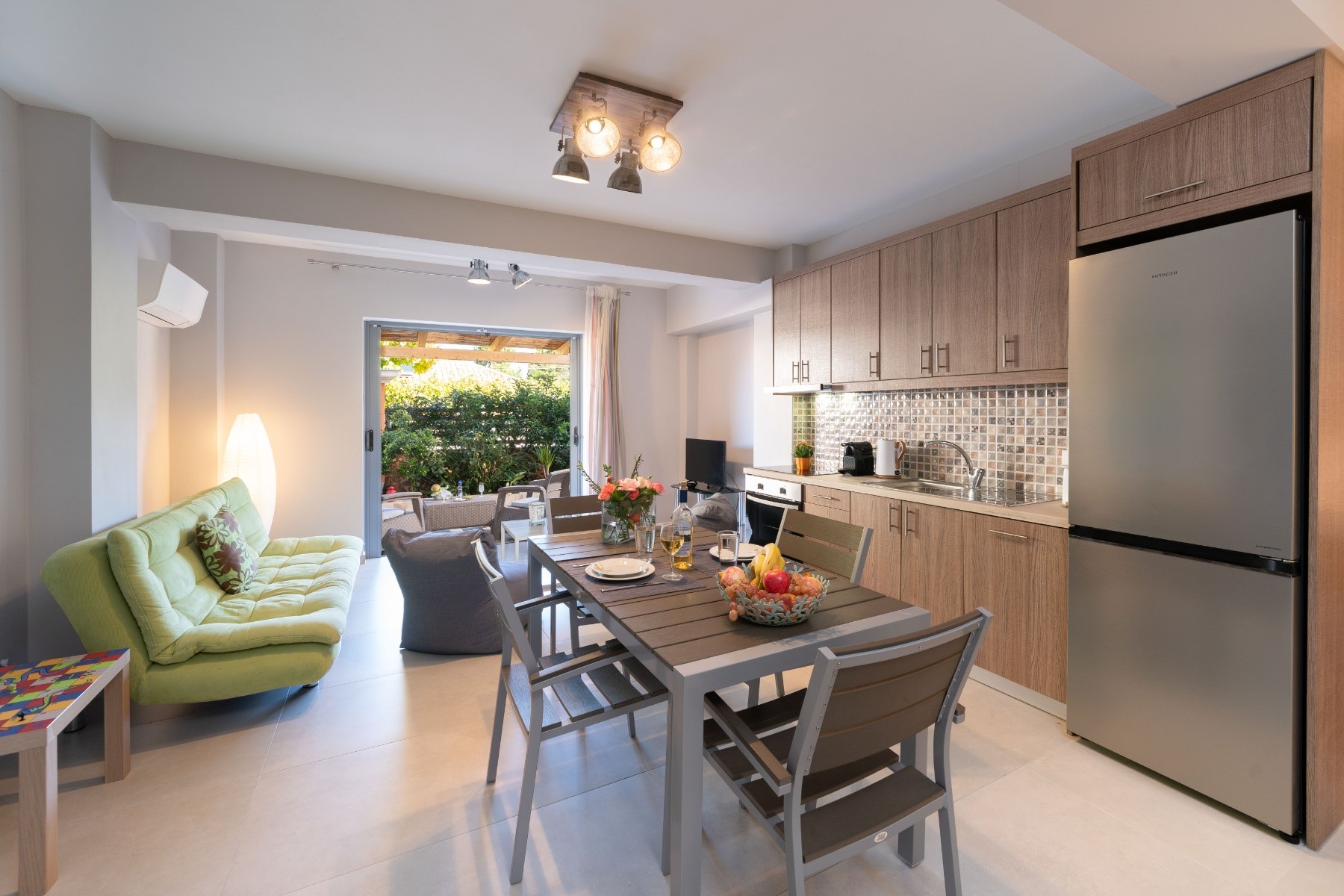 LIVING/ DINING AREA (ground floor): Comfortable living room, dining table, flat screen TV, sofa-bed.