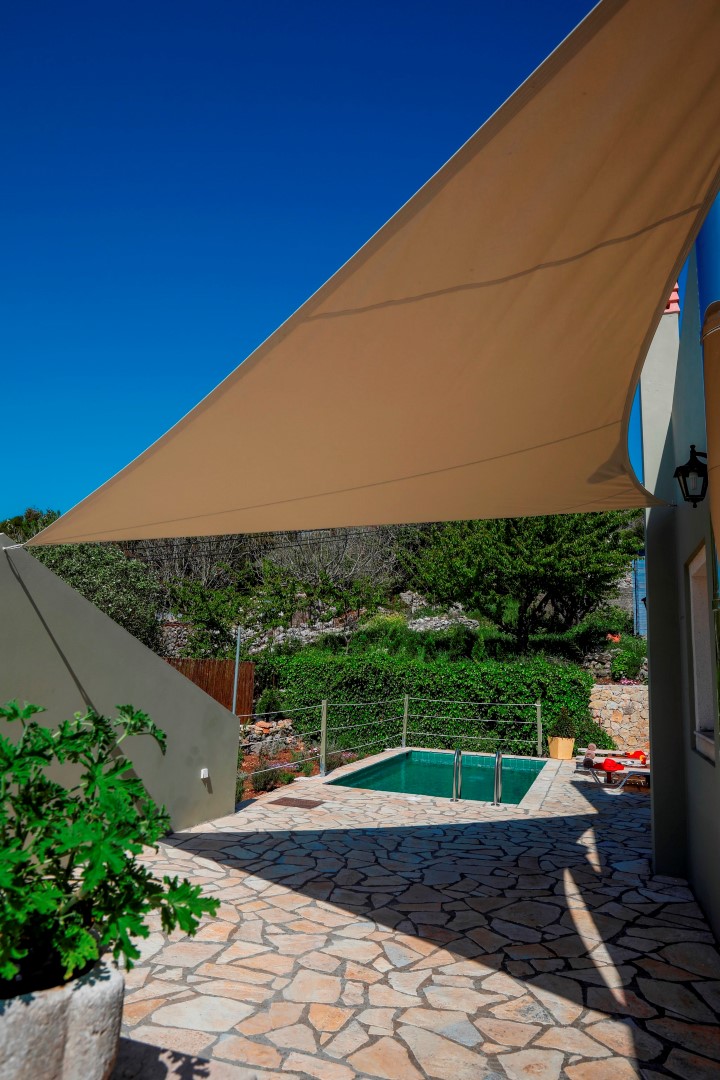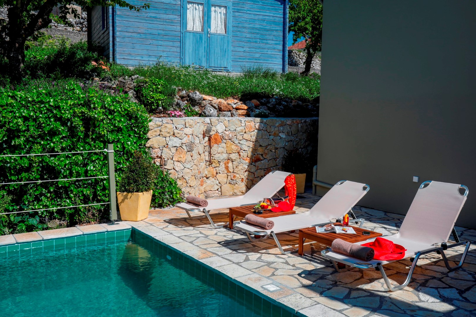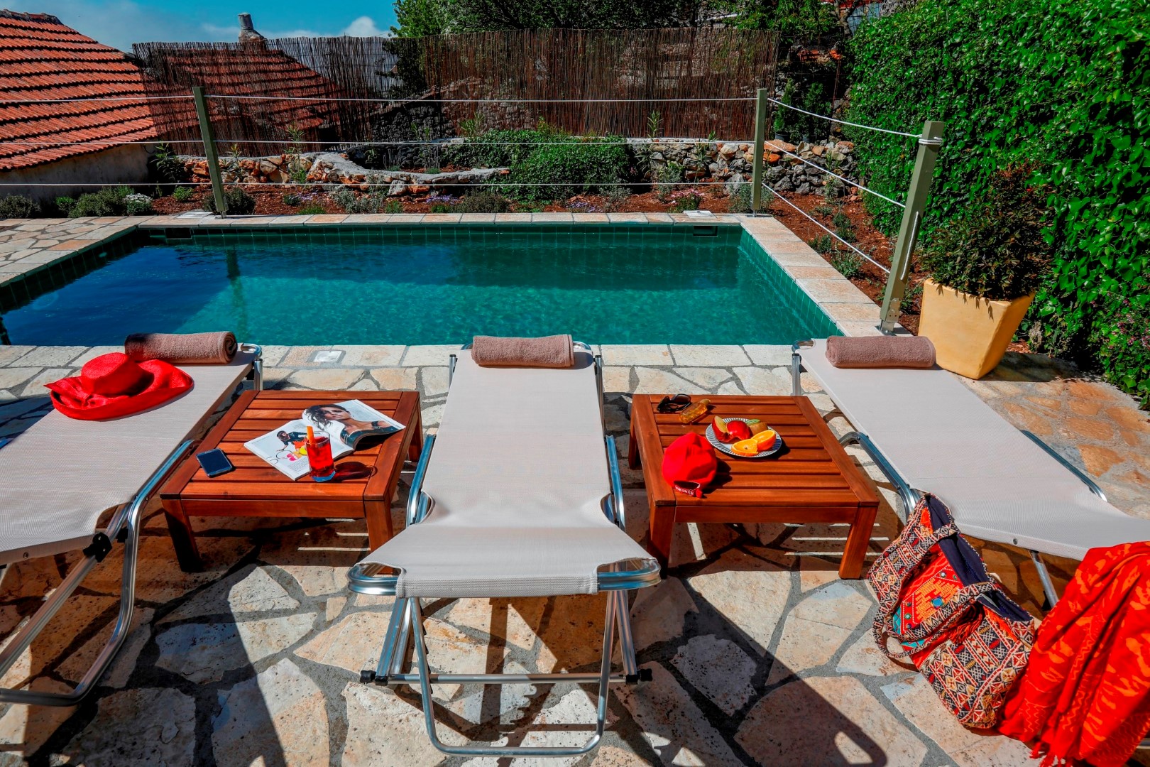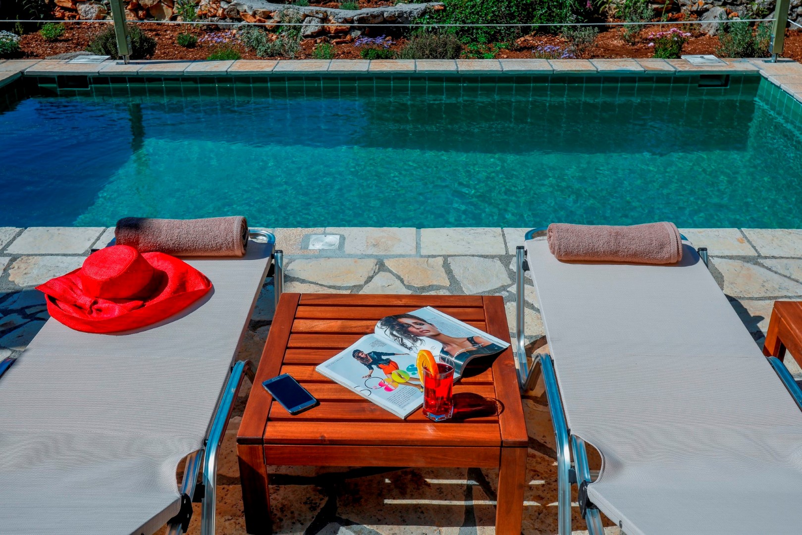 OUTDOORS: Gorgeous terrace with dining area, loungers and umbrellas, swimming pool.